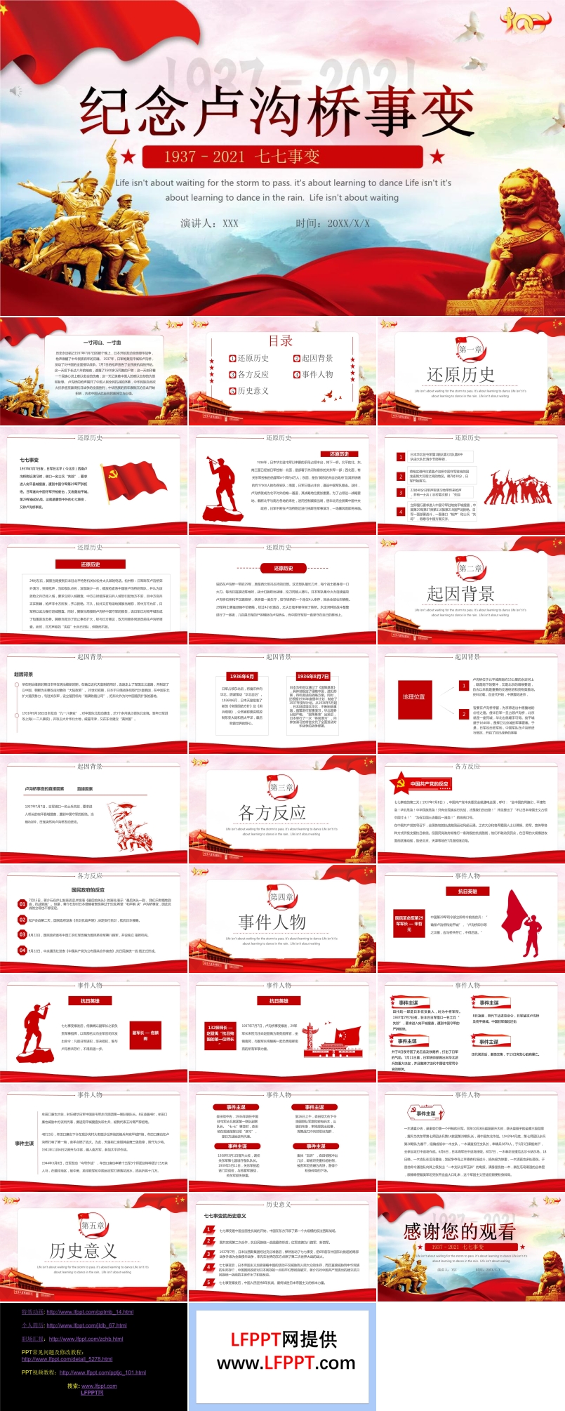 • 這是一套紀念盧溝橋事變的ppt模板,共計30頁??梢哉f,盧溝橋事變正式拉開了中華民族抗日戰(zhàn)爭的序幕。欲加之罪,何患無辭呢?日軍心懷不軌已久,此次事變只是一個導(dǎo)火索,背后充斥的是日軍的虛偽與狡詐。面對這嚴酷殘忍的生存環(huán)境,面對這赤裸裸的挑釁和狂妄,中華民族沒有退縮,而是迎難而上,誓死維護國家主權(quán)以及民族尊嚴。盧溝橋事變,充分彰顯著偉大的民族魂。