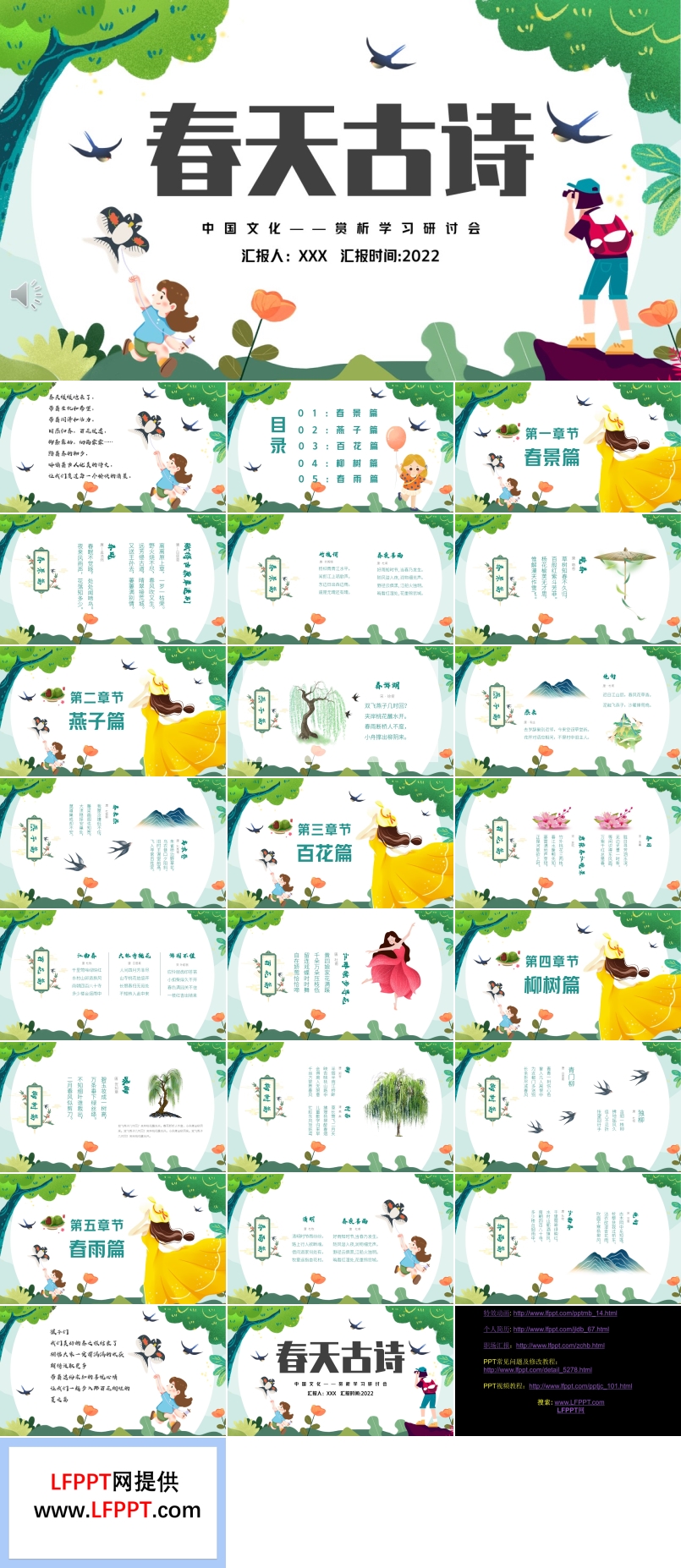 • 這是一篇關于介紹春天古詩ppt課件的PPT,共計25頁。自古以來,描寫春天的詩詞就非常多,春天,萬物復蘇,生機盎然,給人朝氣蓬勃,充滿希望的感覺。古代詩人寫了很多關于春天的詩詞歌賦,用來贊美春天。春天的美,需要我們靜靜去聆聽,感受?!按好卟挥X曉,處處聞啼鳥”就很好的道出了我們對于春天的心境,到處鳥語花香預示著春天的到來。