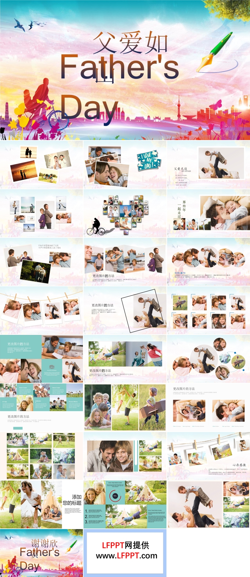 • 父愛如山之父親節(jié)快樂PPT相冊模板,采用多彩風格,象征這父愛的色彩。嚴父慈母,我們的父親陪伴著我們慢慢長大,父愛往往是悄聲無息的,但父愛如山,父愛總是我們最堅強的后盾。