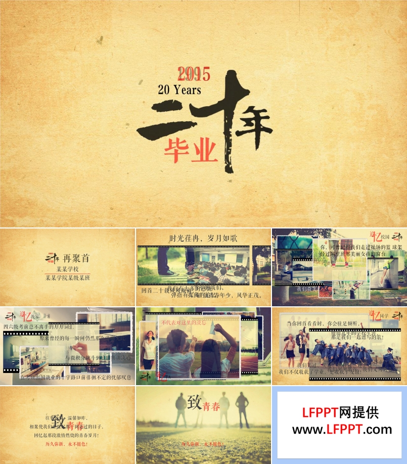 • 懷舊同學聚會畢業(yè)紀念冊PPT模板,是一個以懷舊為主題風格的PPT畢業(yè)相冊模板。PPT以復古的蒙太奇為PPT的開場動畫,棕色的背景下那夾著老式電影膠卷中特有的干擾噪點,仿佛這一切都是那么的朦朧而又清晰。