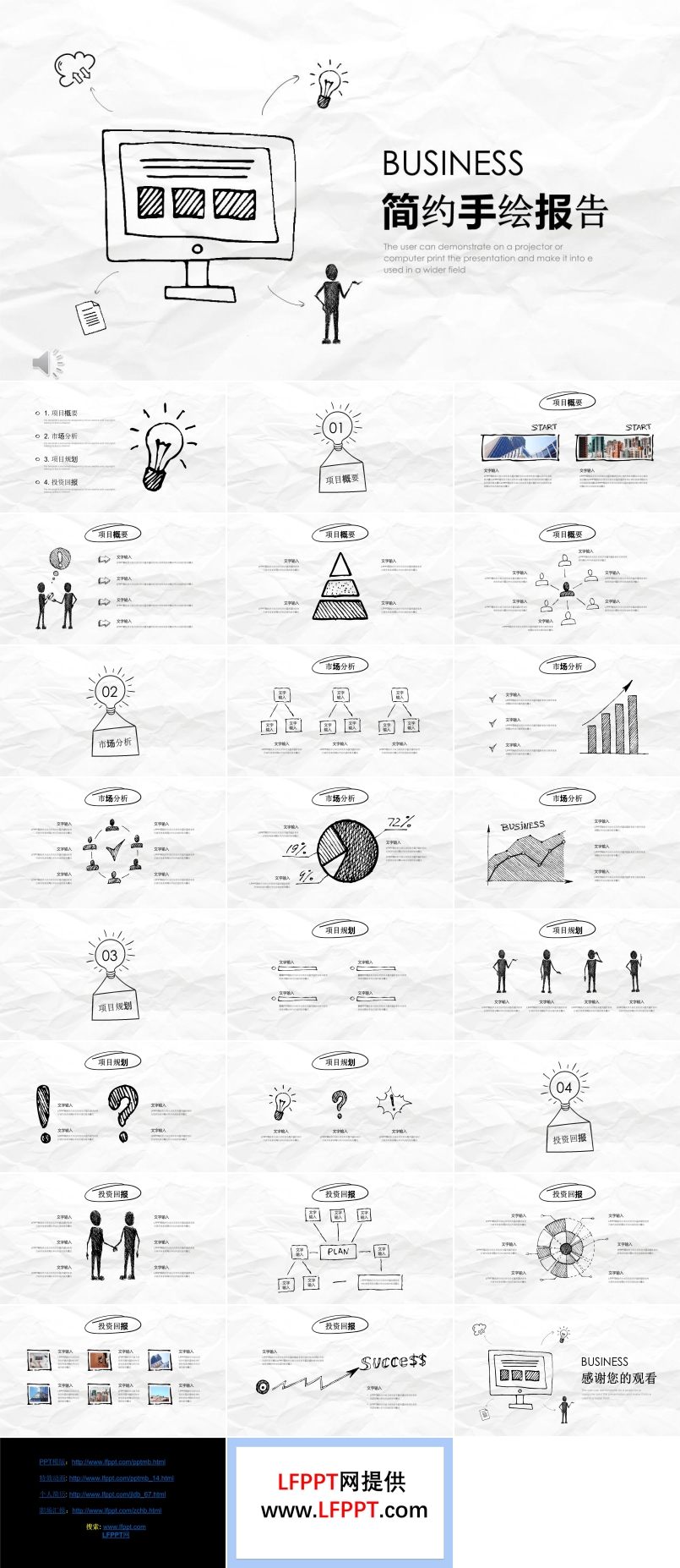 • 淡雅簡(jiǎn)潔手繪風(fēng)PPT模板采用了創(chuàng)意的手繪元素,簡(jiǎn)約的白紙黑字風(fēng)格,整體設(shè)計(jì)簡(jiǎn)潔而富有創(chuàng)意,可用于多種職場(chǎng)工作總結(jié)匯報(bào)。