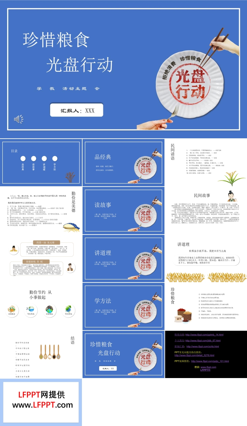 • “鋤禾日當午,汗滴禾下土。誰知盤中餐,粒粒皆辛苦?!边@一首描寫糧食來之不易的艱辛畫面,每顆每粒都是農(nóng)民用辛勤的勞動換來的。這是一套簡約風格的PPT模板素材,共17頁。PPT封面藍色為背景色,餐盤、筷子、叉子等元素構(gòu)成,餐盤上紅色字體“光盤行動”,白色正體字突出主題:珍惜糧食,光盤行動。PPT正文通過以品讀經(jīng)典詩詞;閱讀勤儉故事;曉之以理動之以情的道理講述;學習勤儉的方法等內(nèi)容來宣傳拒絕浪費,珍惜糧食的良好勤儉品德。
