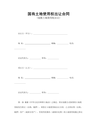 出讓方:中華人民共和國 省(自治區(qū)、直轄市) 市(縣)土地管理局(以下簡稱甲方);法定地址 ;郵政編碼 ;法定代表人:姓名 ;職務(wù) 。
