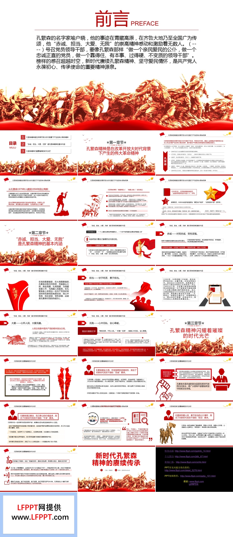 • 這是一個關(guān)于介紹孔繁森精神的PPT模板,共計25頁。今年,是中國共產(chǎn)黨成立100周年,這百年間,有無數(shù)黨員同志秉承中國共產(chǎn)黨敢為人先,全心全意為人民服務的精神在自己的崗位上發(fā)光發(fā)熱。改革開放,百廢待興,正是需要愿意有奔赴前線,犧牲奉獻,帶領(lǐng)人民脫貧攻堅的領(lǐng)路人,孔繁森,就是其中之一,用他的堅韌不拔的意志,愛民為民的赤誠之心,發(fā)揮著共產(chǎn)黨員的先鋒模范作用,扎根基層,帶領(lǐng)人民過上好日子。