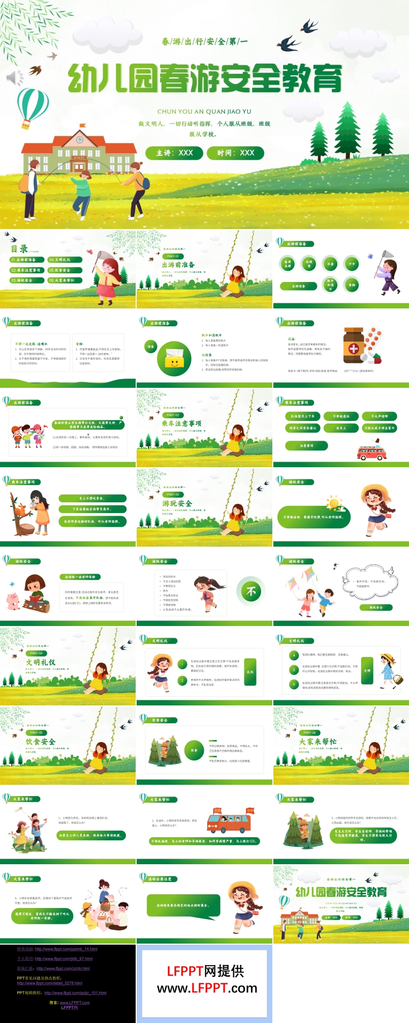 • 這是一套幼兒園春游安全教育的PPT模板,共計38頁。在春天帶領小朋友走進大自然踏春,感受春天的氣息,是幼兒園校外實踐活動經(jīng)常采取的一種方式。由于小朋友年紀較小,自我安全保護能力較弱,因此,在春游前進行安全教師是十分必要的。PPT模板從“春游出行,安全第一”的原則出發(fā),向幼兒園小朋友開展了一次春游安全教育班會課。