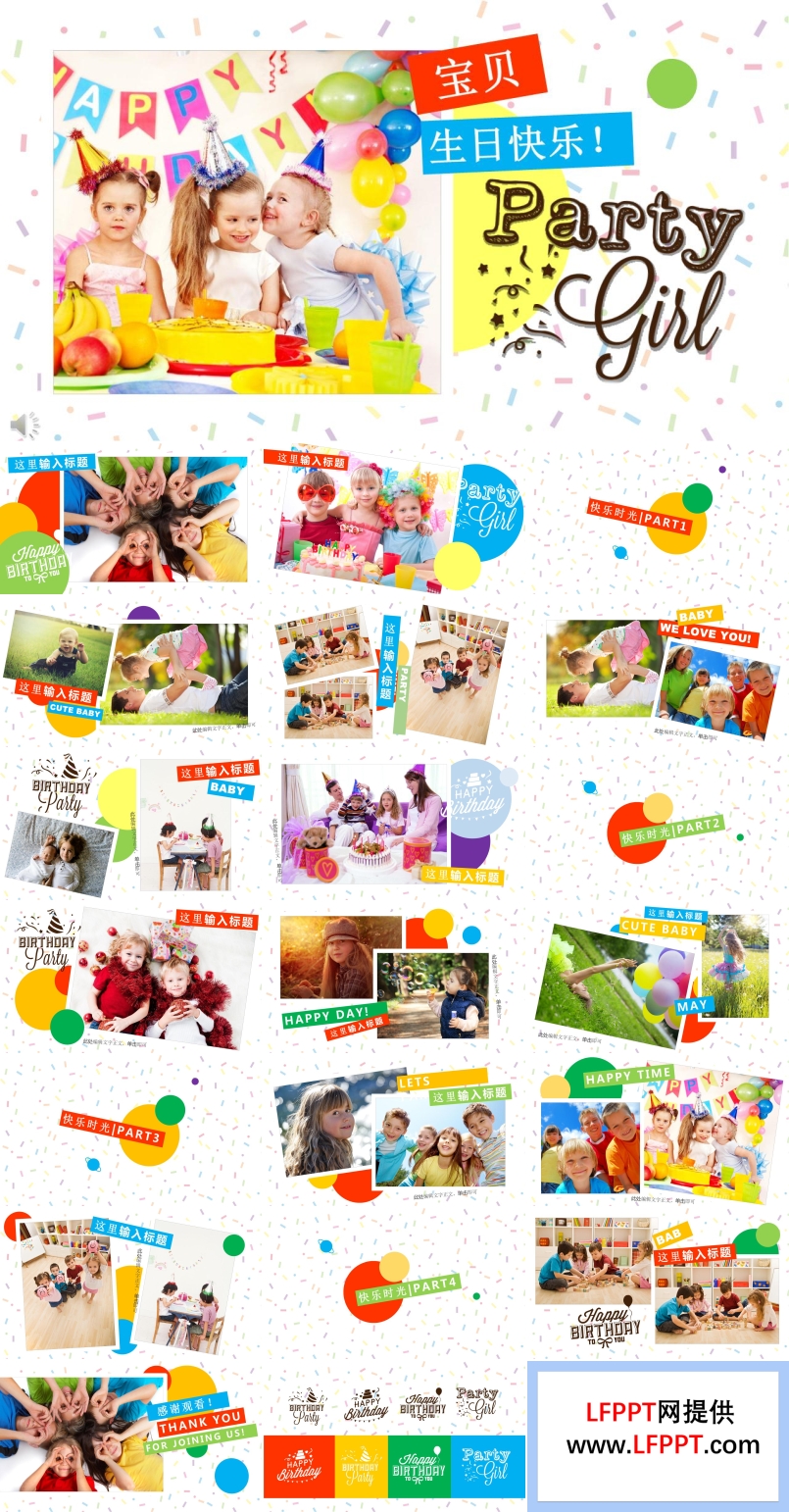 • 糖果紙背景生日快樂PPT相冊(cè)模板,是一個(gè)以可愛 寶寶生日主題的生日模板。以PPT相冊(cè)來記錄寶寶的每一次成長(zhǎng)和沒一次歡樂。