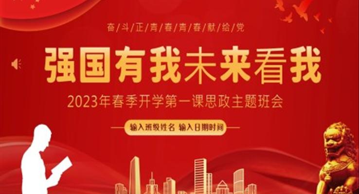 這是一個(gè)關(guān)于《2023強(qiáng)國(guó)有我未來(lái)看我》的PPT。2023年春季開(kāi)學(xué)即將到來(lái),在開(kāi)學(xué)前需要對(duì)同學(xué)們進(jìn)行第一次思政主題班會(huì)課,幫助大家了解關(guān)于黨的二十大的基本知識(shí),提醒大家青春是用來(lái)奮斗的,在奮斗當(dāng)中譜寫(xiě)自己的青春,包括黨的二十大的主題。報(bào)告當(dāng)中有15個(gè)部分,希望同學(xué)們努力學(xué)習(xí),拼搏奮斗,腳踏實(shí)地。通過(guò)這個(gè)ppt,我們將共同了解關(guān)于2023強(qiáng)國(guó)有我未來(lái)看我的相關(guān)內(nèi)容。