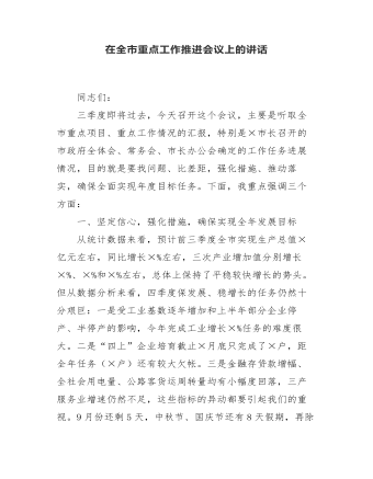 在全市重點(diǎn)工作推進(jìn)會(huì)議上的講話